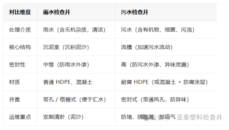 尽管雨水检查井和污水检查井同属市政 / 建筑排水系统的关键组成部分,但由于所处理介质的本质差异及功能需求的不同侧重,它们在设计方案、结构形式、材质选用、运维方式以及外观特征等方面,均存在不容忽视的显著区别。
